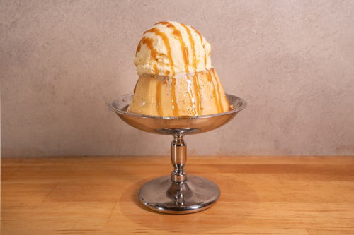 昔ながらの固め食感プリンに、濃厚バニラアイスと香ばしいキャラメルソースを添えた贅沢な一品。