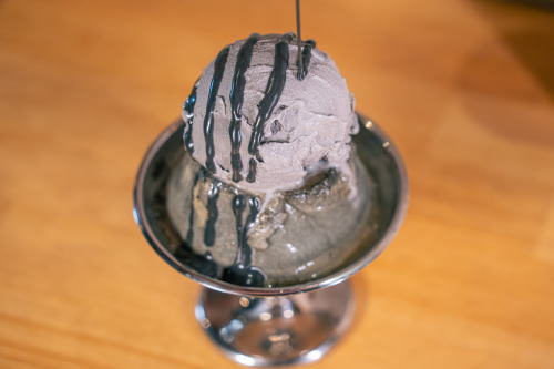 香ばしい黒ごまの風味広がる固めプリンに、黒ごまアイスと深みある黒ごまソースを重ねました。