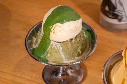 上品な抹茶香る固めプリンに、なめらかバニラアイスと抹茶ソースを合わせた大人の味わい。